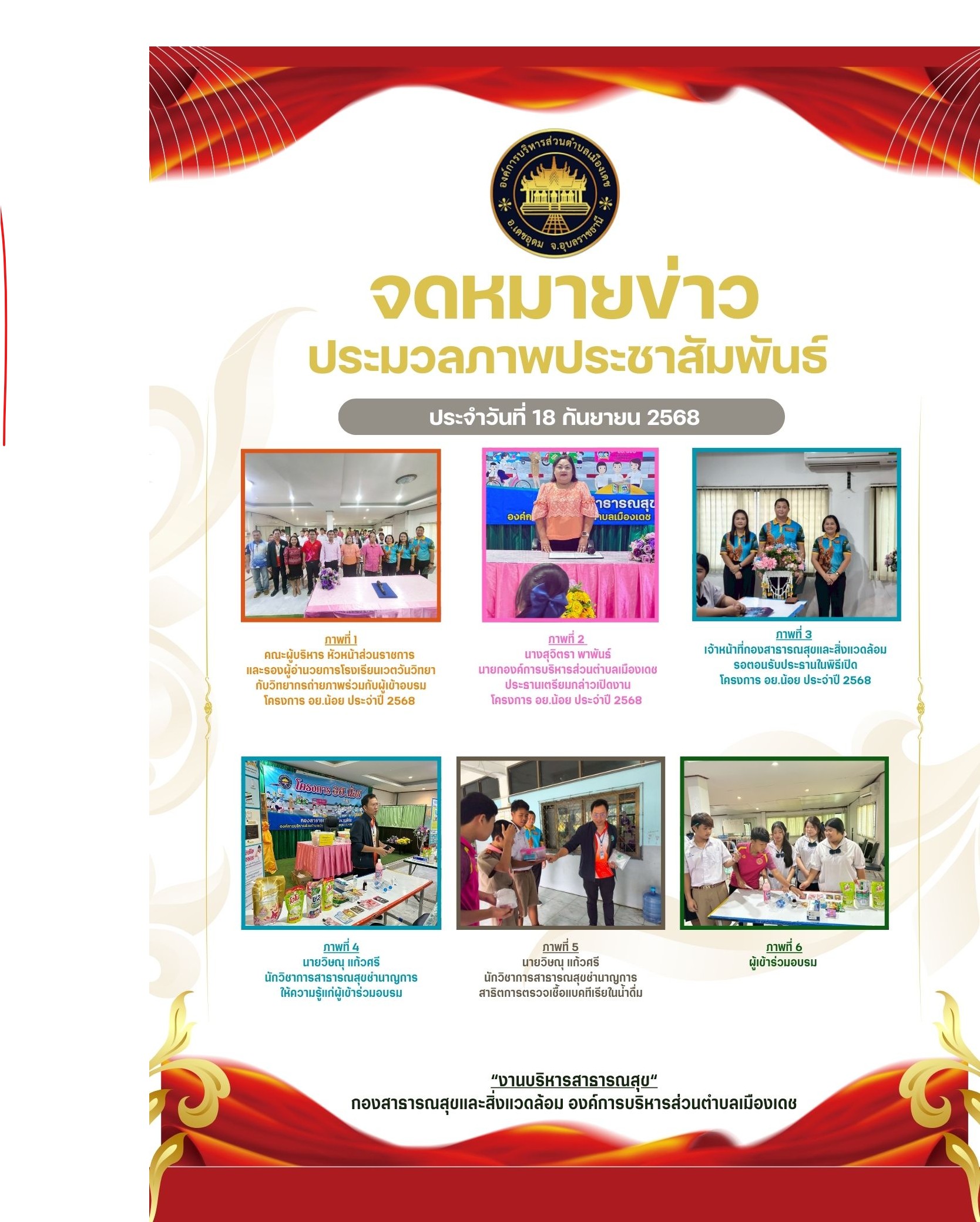 Thursday, 18 September 2025 09:23วันที่ 18 กันยายน 2568 เวลา 09.00 น. นางสุจิตรา พาพันธ์ นายกองค์การบริหารส่วนตำบลเมืองเดช พร้อมด้วยนายชลัท แสนศาลา รองปลัดองค์การบริหารส่วนตำบลเมืองเดช และหัวหน้าส่วนราชการ พนักงานส่วนตำบล องค์การบริหารส่วนตำบลเมืองเดช เป็นประธานในพิธีเปิดโครงการ อย.น้อย ประจำปี 2568 ดำเนินการเพื่อให้ความรู้และเสริมสร้างทักษะเกี่ยวกับการเลือกซื้อ/เลือกใช้อาหารยาและเครื่องสำอาง สามารถหลีกเลี่ยงผลิตภัณฑ์เกี่ยวกับอาหารยาและเครื่องสำอางที่มีส่วนประกอบของสารปนเปื้อนในอาหารหรือสารห้ามใช้และสารอันตรายได้ ณ โรงเรียนเวตวันวิทยา ตำบลเมืองเดช อำเภอเดชอุดม จังหวัดอุบลราชธานี
