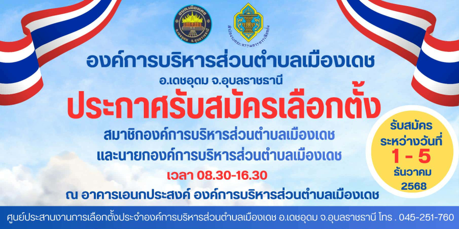 ประกาศประชาสัมพันธ์องค์การบริหารส่วนตำบลเมืองเดช เรื่อง รับสมัครเลือกตั้ง สมาชิกองค์การบริหารส่วนตำบลเมืองเดช และนายกองค์การบริหารส่วนตำบลเมืองเดช