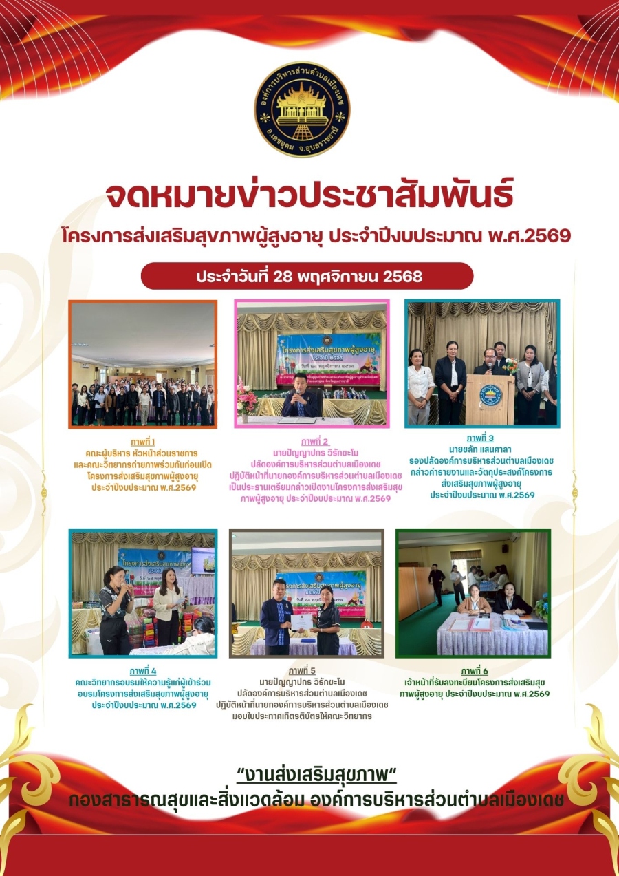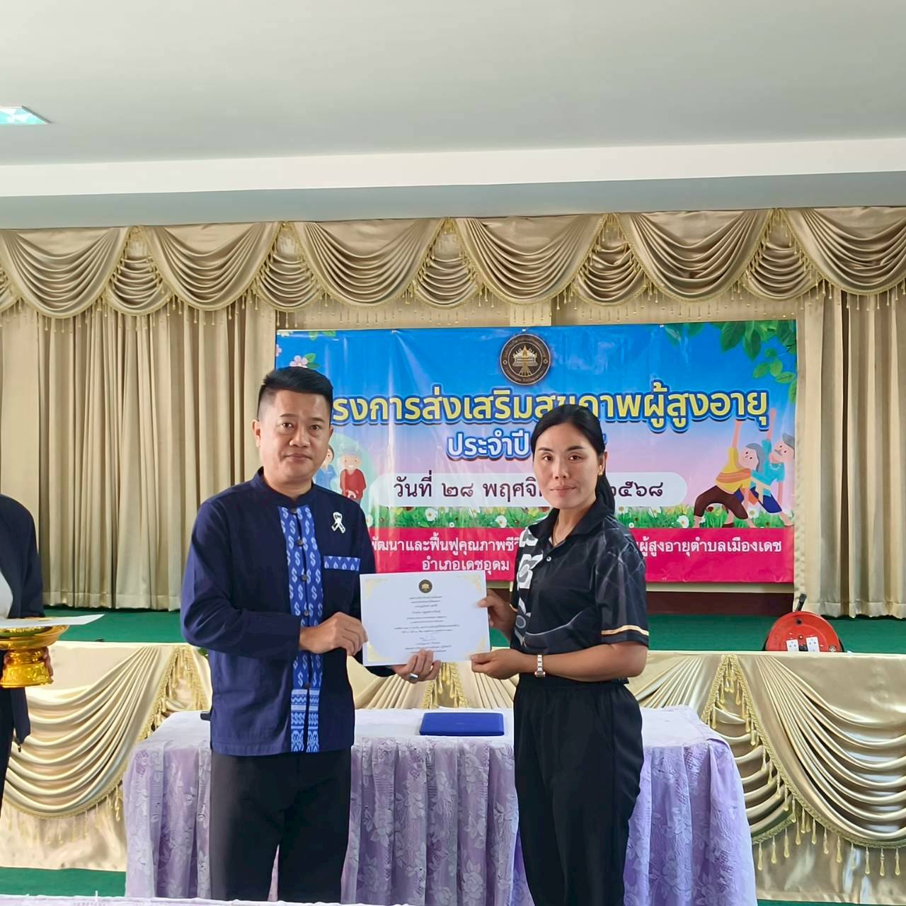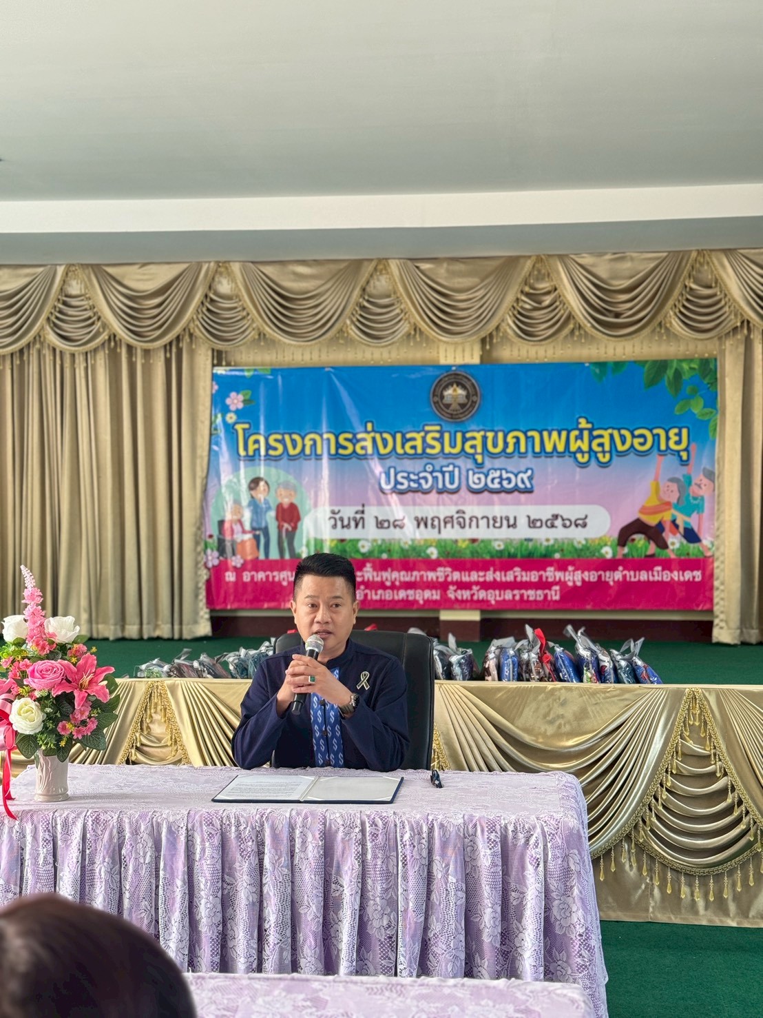 Friday, 28 November 2025 09:59วันที่ 28 พฤศจิกายน 2568 เวลา 09.00 น. นายปัญญาปกร วิรักขะโม ปลัดองค์การบริหารส่วนตำบลเมืองเดช ปฏิบัติหน้าที่นายกองค์การบริหารส่วนตำบลเมืองเดช พร้อมด้วยนายชลัท แสนศาลา รองปลัดองค์การบริหารส่วนตำบลเมืองเดช และหัวหน้าส่วนราชการ พนักงานส่วนตำบล ได้เป็นประธานในพิธีเปิดโครงการส่งเสริมสุขภาพผู้สูงอายุ ประจำปีงบประมาณ พ.ศ.2569 วัตถุประสงค์เพื่อให้ผู้สูงอายุสามารถดูแลสุขภาพตนเองได้และมีสุขภาพที่ดี ด้วยการออกกำลังกายที่เหมาะสมของผู้สูงอายุ ณ อาคาร ศพอส.อบต.เมืองเดช ตำบลเมืองเดช อำเภอเดชอุดม จังหวัดอุบลราชธานี