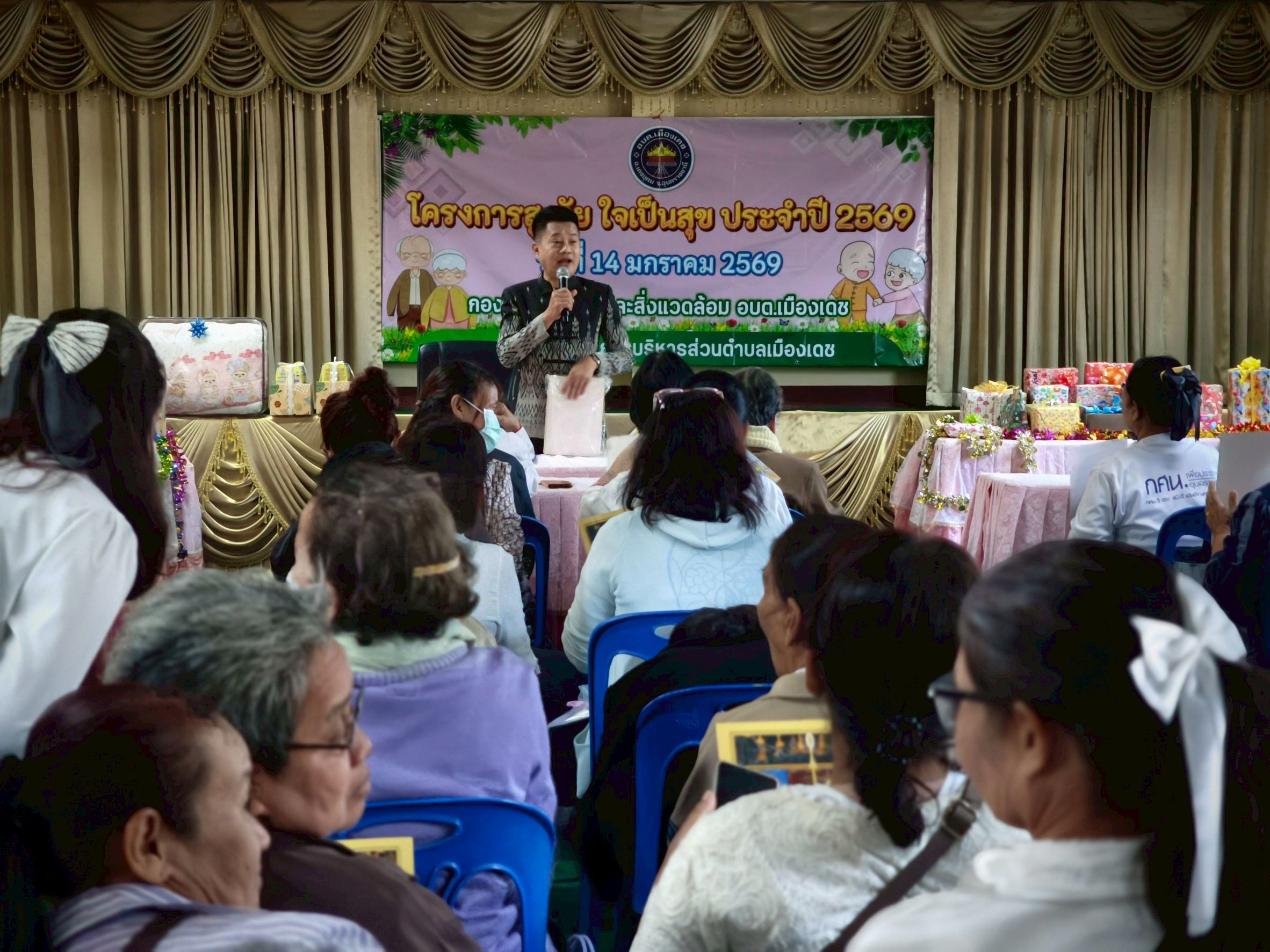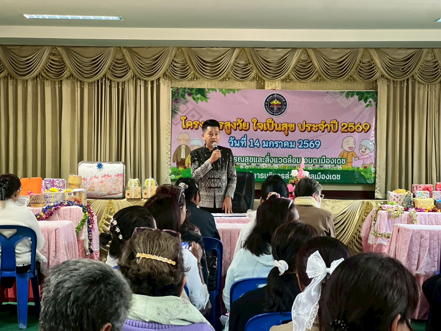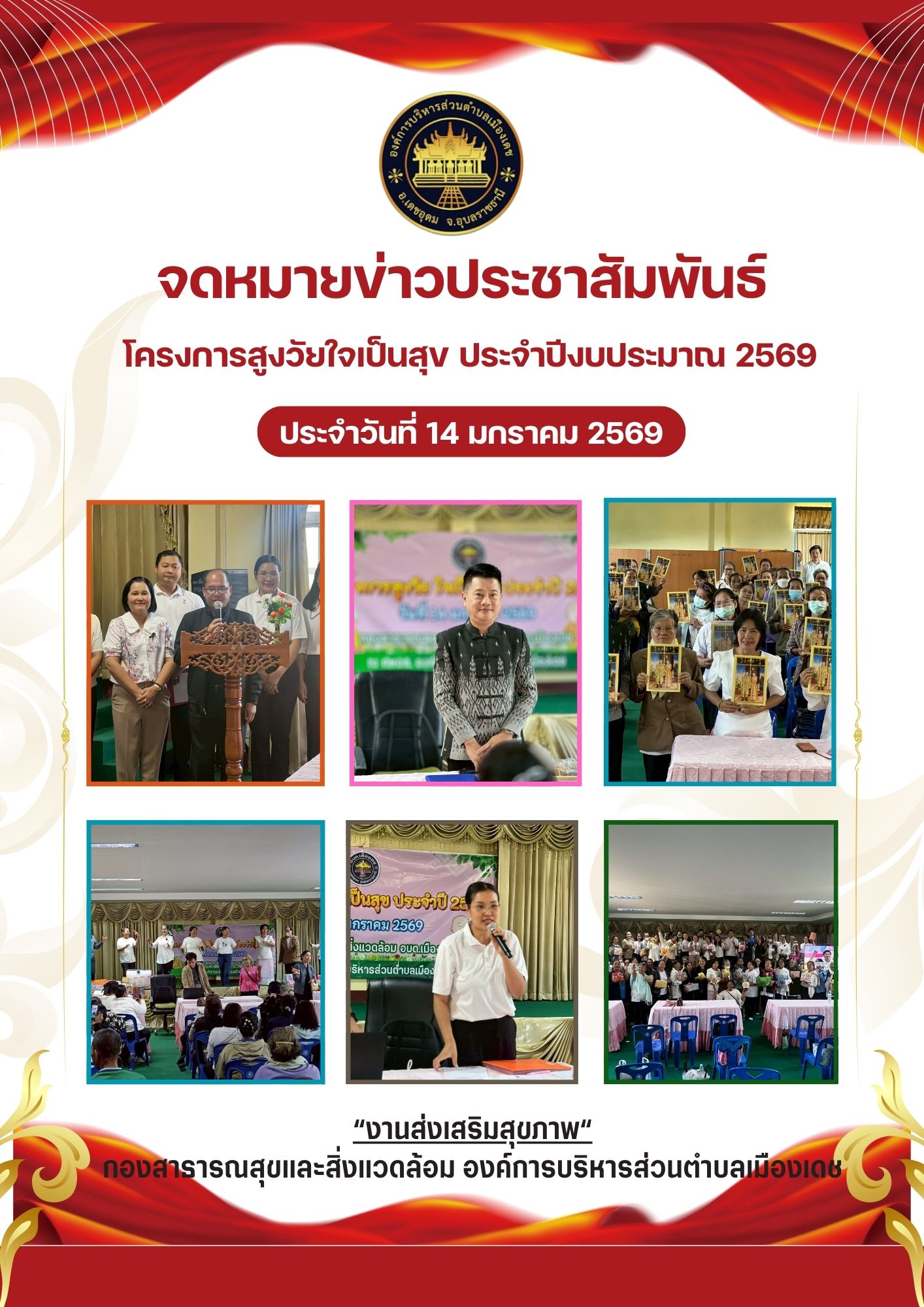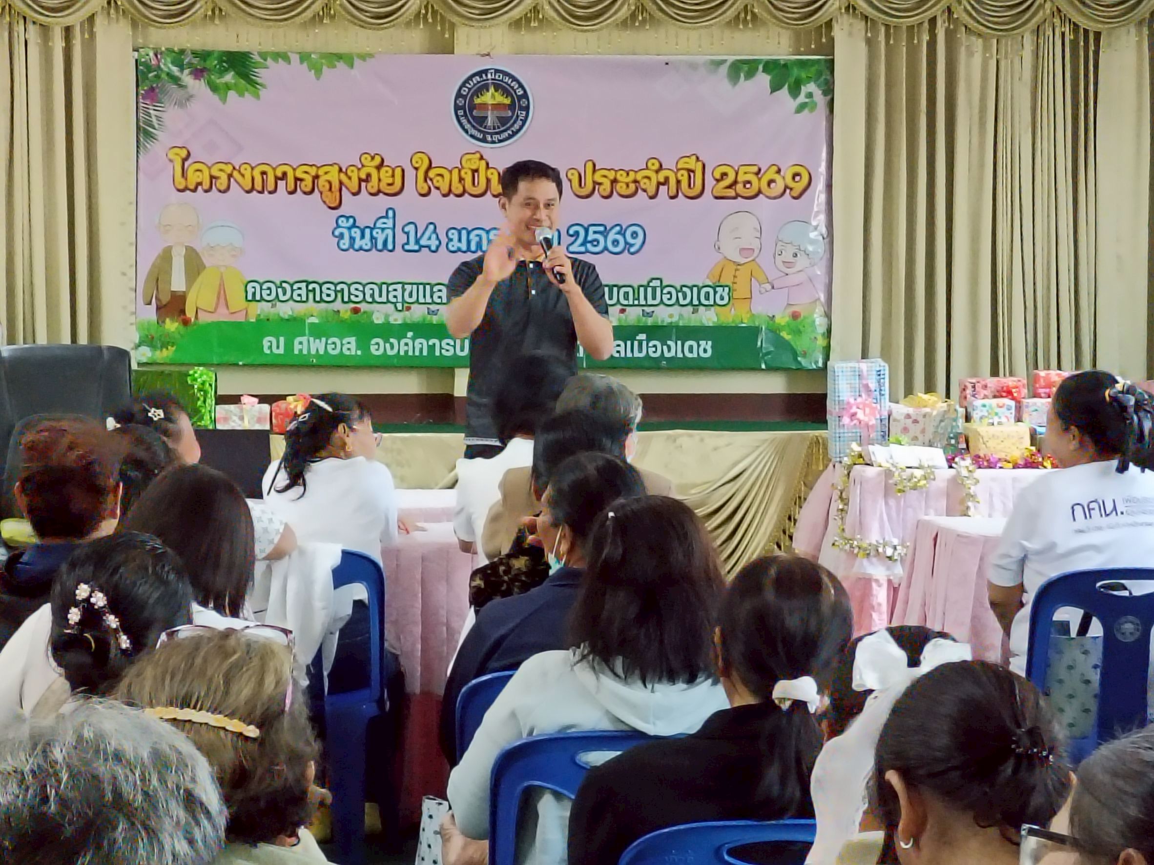 Wednesday, 14 January 2026 15:19วันที่ 14 มกราคม 2569 เวลา 09.00 น. นายปัญญาปกร วิรักขะโม ปลัดองค์การบริหารส่วนตำบลเมืองเดช ปฏิบัติหน้าที่นายกองค์การบริหารส่วนตำบลเมืองเดช พร้อมด้วยหัวหน้าส่วนราชการ พนักงานส่วนตำบล และคณะวิทยากร จากศูนย์สุขภาพชุมชนเมืองบ้านแขมเจริญ และศูนย์ส่งเสริมการเรียนรู้ระดับอำเภอเดชอุดมได้เป็นประธานในพิธีเปิดโครงการสูงวัยใจเป็นสุข ประจำปีงบประมาณ 2569 วัตถุประสงค์ดังนี้ 1. เพื่อส่งเสริมสุขภาพกายและสุขภาพจิตของผู้สูงอายุในชุมชน 2. เพื่อป้องกันภาวะซึมเศร้า ความเครียด และความโดดเดียวในผู้สูงอายุ 3. เพื่อส่งเสริมการเรียนรู้และการทำกิจกรรมร่วมกันในสังคม 4. เพื่อสร้างเครือข่ายผู้สูงอายุที่เข้มแข็งในชุมชน ณ อาคาร ศพอส.อบต.เมืองเดช ตำบลเมืองเดช อำเภอเดชอุดม จังหวัดอุบลราชธานี