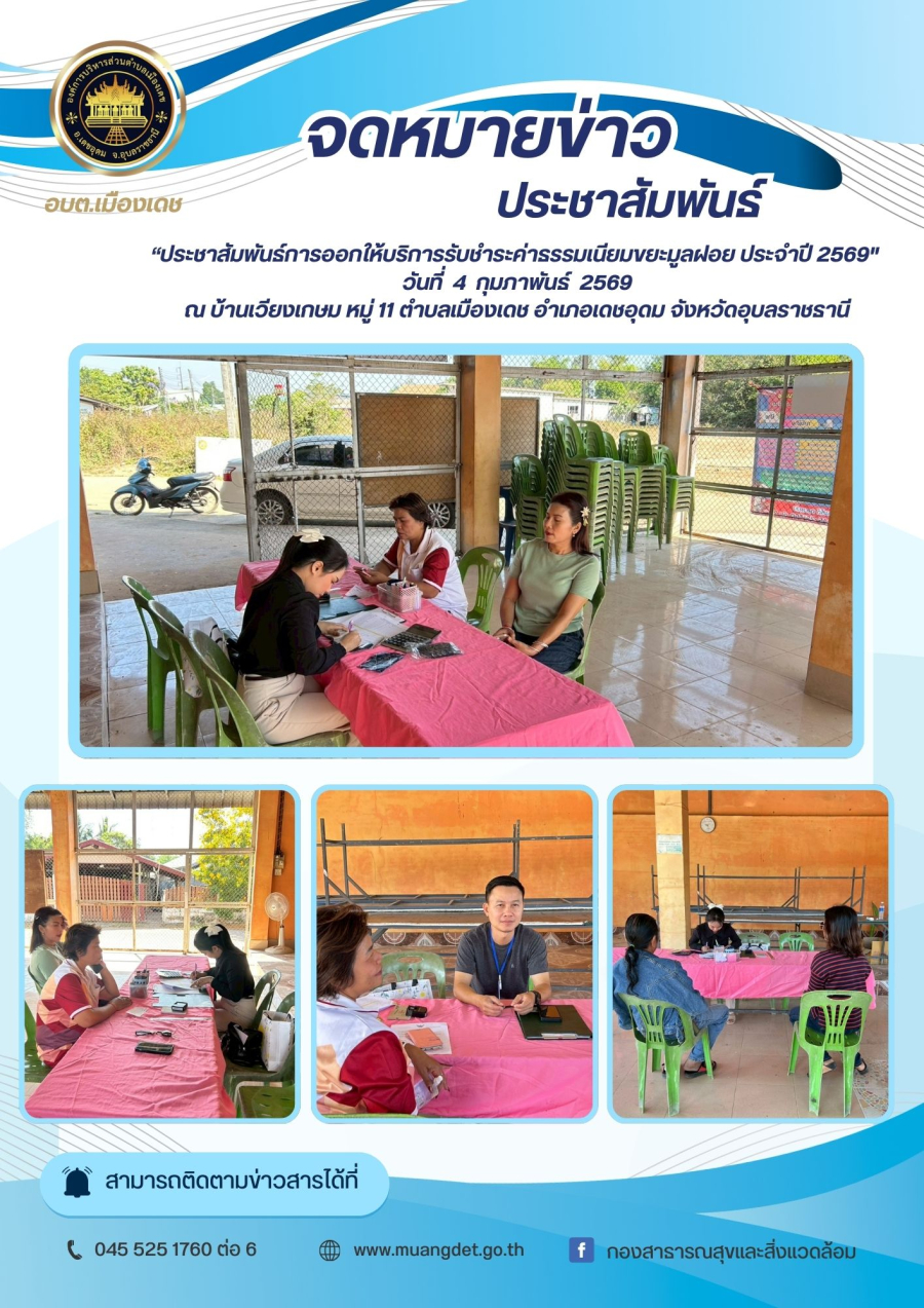 Wednesday, 04 February 2026 14:25วันที่ 4 กุมภาพันธ์ 2569 งานสิ่งแวดล้อม กองสาธารณสุขและสิ่งแวดล้อม องค์การบริหารส่วนตำบลเมืองเดช ได้ออกให้บริการรับชำระค่าธรรมเนียมขยะมูลฝอยนอกสถานที่ ประจำปีงบประมาณ 2569 ณ ศาลาประชาคมบ้านเวียงเกษม หมู่ที่ 11 ตำบลเมืองเดช อำเภอเดชอุดม จังหวัดอุบลราชธานี และมีผู้มาใช้บริการ จำนวน 26 ราย ได้รับความร่วมมือจากผู้นำชุมชนเป็นอย่างดี