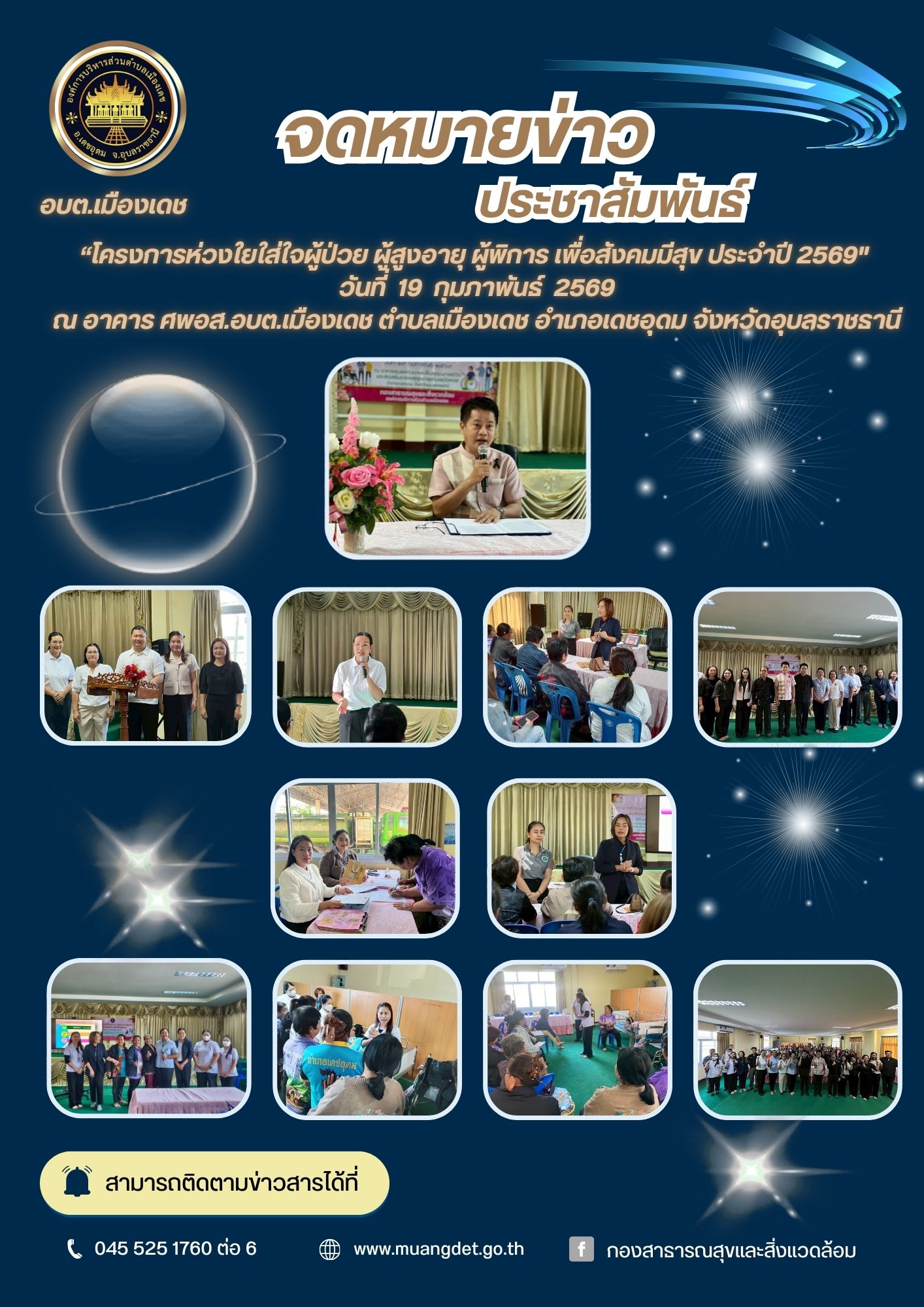 Thursday, 19 February 2026 15:09วันที่ 19 กุมภาพันธ์ 2569 เวลา 09.00 น. นายปัญญาปกร วิรักขะโม ปลัดองค์การบริหารส่วนตำบลเมืองเดช รักษาราชการแทนนายกองค์การบริหารส่วนตำบลเมืองเดช พร้อมด้วยนายชลัท แสนศาลา รองปลัดองค์การบริหารส่วนตำบลเมืองเดช และหัวหน้าส่วนราชการ พนักงานส่วนตำบล และวิทยากร จากศูนย์สุขภาพชุมชนเมืองบ้านโคกเจริญ ศูนย์สุขภาพชุมชนเมืองบ้านแขมเจริญ และศูนย์สุขภาพชุมชนเมืองบ้านชัยอุดม ได้เป็นประธานในพิธีเปิดโครงการห่วงใยใส่ใจผู้ป่วย ผู้สูงอายุ ผู้พิการ เพื่อสังคมมีสุข ประจำปี 2569 โดยมีวัตถุประสงค์ ดังนี้ 1. เพื่อให้ประชาชนที่ดูแลผู้ป่วย ผู้สูงอายุ ผู้พิการ มีความรู้ความเข้าใจในการดูแลผู้ป่วย ผู้สูงอายุ ผู้พิการ ช่วยเหลือฟื้นฟูด้านร่างกายและจิตใจให้มีสุขภาพที่ดีขึ้น 2. เพื่อส่งเสริมการมีส่วนร่วมของคนในชุมชนสามารถดูแลและประเมินอาการผู้ป่วย ผู้สูงอายุ ผู้พิการ ได้และสามารถแจ้งปัญหาเพื่อหาแนวทางช่วยเหลือให้ลดความเสี่ยงจากการเสียชีวิตด้วยการไม่มีเหตุอันควร 3. เพื่อสร้างกลุ่มแกนนำในการดูแลผู้ป่วย ผู้สูงอายุ ผู้พิการ ในชุมชนให้มีกำลังใจเห็นคุณของชีวิตและพร้อมที่จะดำรงชีวิตต่อไปในสังคมอย่างมีความสุข เกิดการดูแลช่วยเหลือเชิงรุกและต่อเนื่องในชุมชน ณ อาคาร ศพอส.อบต.เมืองเดช ตำบลเมืองเดช อำเภอเดชอุดม จังหวัดอุบลราชธานี