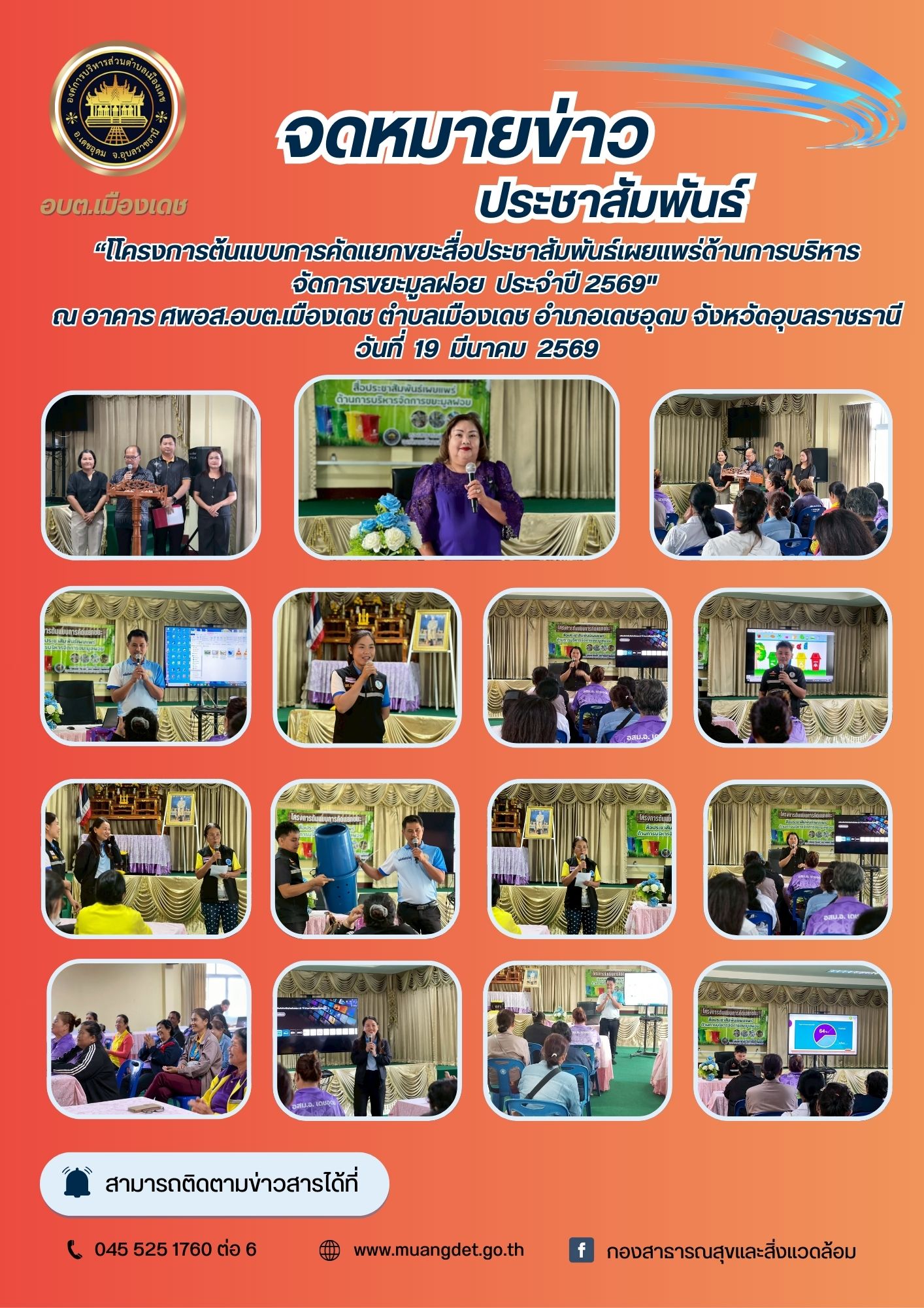 Thursday, 19 March 2026 15:19วันที่ 19 มีนาคม 2569 เวลา 09.00 น. นางสุจิตรา พาพันธ์ นายกองค์การบริหารส่วนตำบลเมืองเดช พร้อมด้วยนายชลัท แสนศาลา รองปลัดองค์การบริหารส่วนตำบลเมืองเดช และหัวหน้าส่วนราชการ พนักงานส่วนตำบล เป็นประธานในพิธีเปิดโครงการต้นแบบการคัดแยกขยะสื่อประชาสัมพันธ์เผยแพร่ด้านการบริหารจัดการขยะมูลฝอย ประจำปีงบประมาณ 2569 เพื่อสร้างชุมชนต้นแบบที่มีการบริหารจัดการขยะได้ตั้งแต่ในครัวเรือนและส่งเสริมให้ประชาชนรู้จักและเข้าใจการคัดแยกขยะมูลฝอยในครัวเรือน ณ อาคาร ศพอส.อบต.เมืองเดช ตำบลเมืองเดช อำเภอเดชอุดม จังหวัดอุบลราชธานี