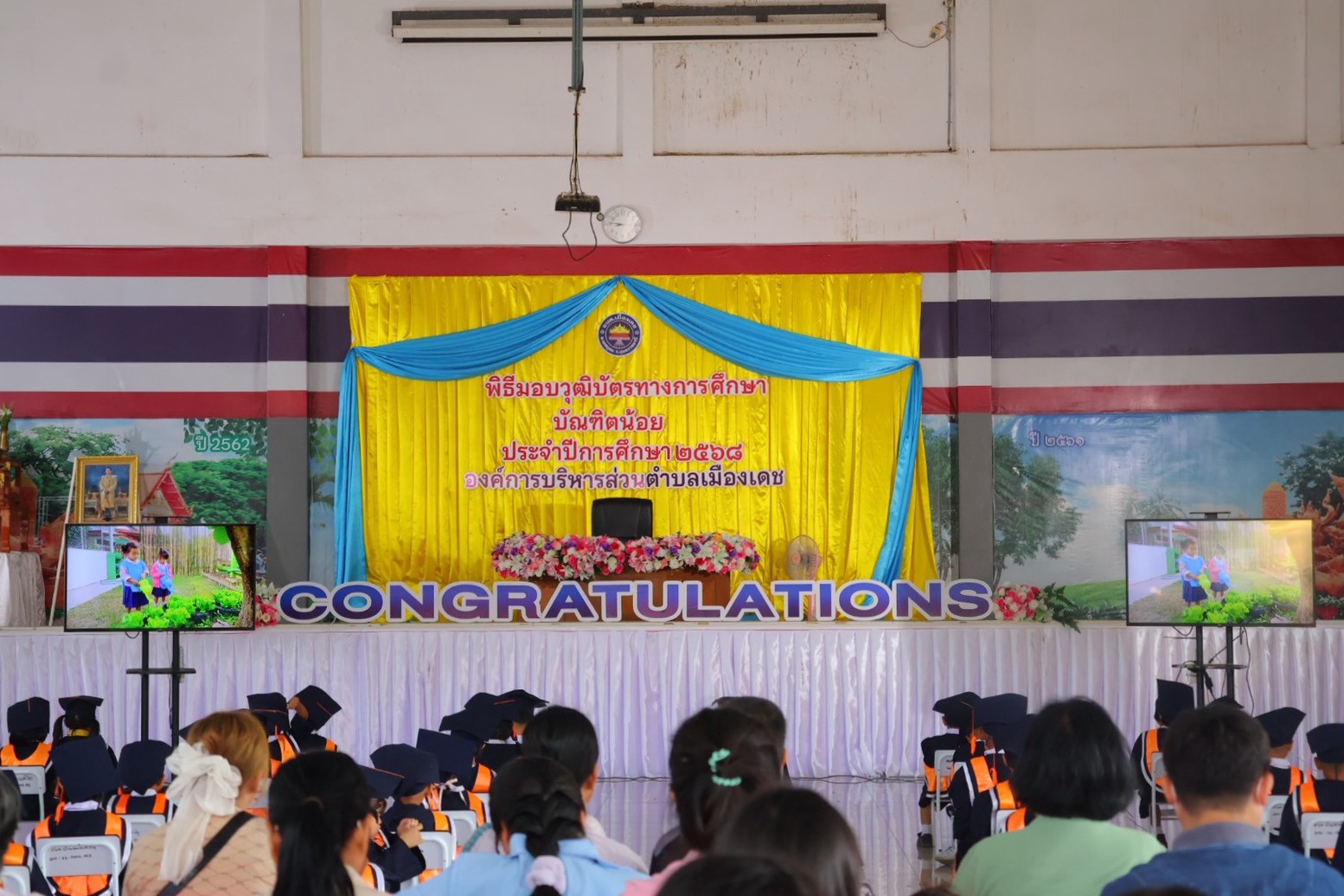 Tuesday, 31 March 2026 09:16วันที่ 31 มีนาคม 2569 เวลา 09.00 น. องค์การบริหารส่วนตำบลเมืองเดช ด้วยการนำของ นางสุจิตรา พาพันธ์ นายกองค์การบริหารส่วนตำบลเมืองเดช ได้เป็นประธานในพิธีมอบวุฒิบัตรแก่บัณฑิตน้อย พร้อมด้วยคณะผู้บริหาร หัวหน้าส่วนราชการ และคณะกรรมการศูนย์พัฒนาเด็กเล็ก เพื่อเป็นการพัฒนาเด็กปฐมวัยให้มีความพร้อมทั้งด้านร่างกาย อารมณ์ จิตใจ สังคม และสติปัญญา และเสริมสร้างให้เด็กปฐมวัยให้มีพัฒนาการอย่างสมดุล เป็นคนดี คนเก่ง มีความสุขและเติบโตเป็นพลเมืองที่ดี ณ อาคารเอนกประสงค์องค์การบริหารส่วนตำบลเมืองเดช อำเภอเดชอุดม จังหวัดอุบลราชธานี