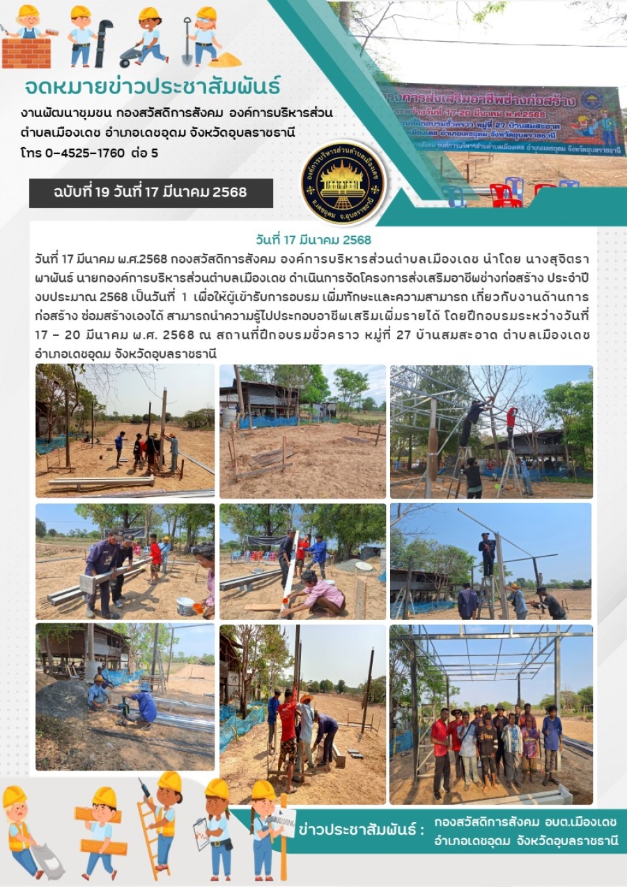 โครงการส่งเสริมอาชีพช่างก่อสร้าง ประจำปีงบประมาณ 2568 วันที่ 1 ฝึกอบรมระหว่างวันที่ 17 - 20 มีนาคม 2568 ณ สถานที่ฝึกอบรมชั่วคราว หมู่ที่ 27 บ้านสมสะอาด ต.เมืองเดช อ.เดชอุดม จ.อุบลราชธานี