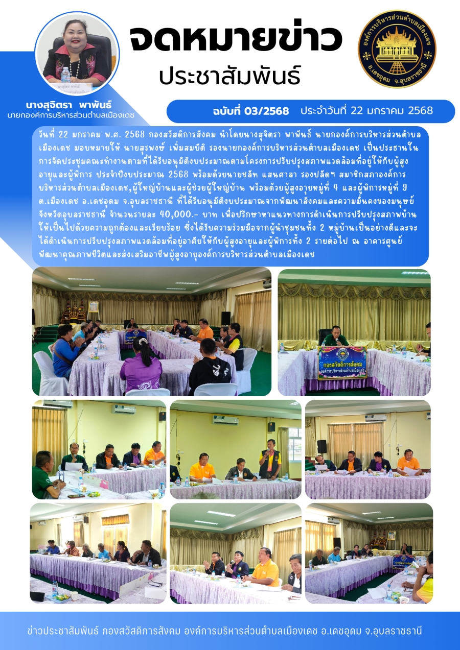 วันที่ 22 มกราคม พ.ศ. 2568 กองสวัสดิการสังคม นำโดยนางสุจิตรา พาพันธ์ นายกองค์การบริหารส่วนตำบลเมืองเดช มอบหมายให้ นายสุรพงษ์ เพิ่มสมบัติ รองนายกองค์การบริหารส่วนตำบลเมืองเดช เป็นประธานในการจัดประชุมคณะทำงานตามที่ได้รับอนุมัติงบประมาณตามโครงการปรับปรุงสภาพแวดล้อมที่อยู่ให้กับผู้สูงอายุและผู้พิการ ประจำปีงบประมาณ 2568 พร้อมด้วยนายชลัท แสนศาลา รองปลัดฯ สมาชิกสภาองค์การบริหารส่วนตำบลเมืองเดช,ผู้ใหญ่บ้านและผู้ช่วยผู้ใหญ่บ้าน พร้อมด้วยผู้สูงอาุยหมู่ที่ 4 และผู้พิการหมู่ที่ 9 ต.เมืองเดช อ.เดชอุดม จ.อุบลราชธานี ที่ได้รับอนุมัติงบประมาณจากพัฒนาสังคมและความมั่่นคงของมนุษย์จังหวัดอุบลราชธานี จำนวนรายละ 40,000.- บาท เพื่อปรึกษาหาแนวทางการดำเนินการปรับปรุงสภาพบ้านให้เป็นไปด้วยความถูกต้องและเรียบร้อย ซึ่งได้รับความร่วมมือจากผู้นำชุมชนทั้ง 2 หมู่บ้านเป็นอย่างดีและจะได้ดำเนินการปรับปรุงสภาพแวดล้อมที่อยู่อาศัยให้กับผู้สูงอายุและผู้พิการทั้ง 2 รายต่อไป ณ อาคารศูนย์พัฒนาคุณภาพชีวิตและส่งเสริมอาชีพผู้สูงอายุองค์การบริหารส่วนตำบลเมืองเดช