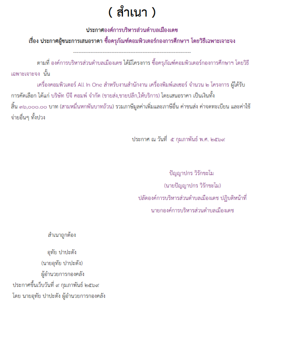 ซื้อครุภัณฑ์คอมพิวเตอร์กองการศึกษาฯ โดยวิธีเฉพาะเจาะจง (เลขที่โครงการ : 69029032075)