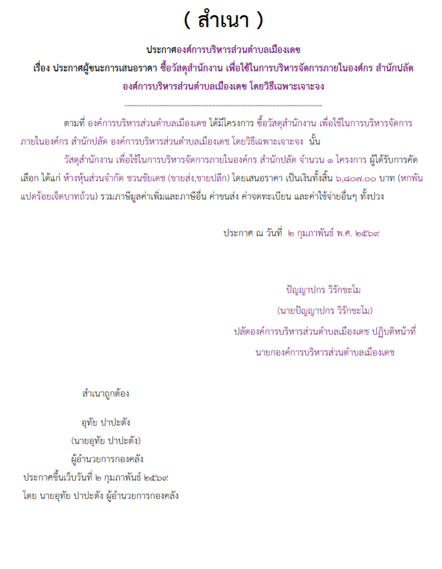 ซื้อวัสดุสำนักงาน เพื่อใช้ในการบริหารจัดการภายในองค์กร สำนักปลัด องค์การบริหารส่วนตำบลเมืองเดช โดยวิธีเฉพาะเจาะจง (เลขที่โครงการ : 69019498215)