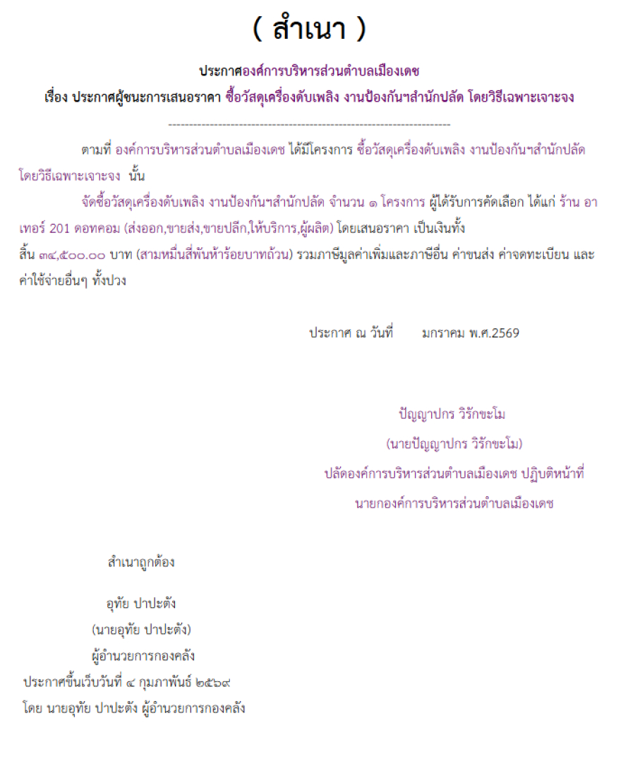 ซื้อวัสดุเครื่องดับเพลิง งานป้องกันฯสำนักปลัด โดยวิธีเฉพาะเจาะจง (เลขที่โครงการ : 69029025846) Friday, 06 February 2026 14:07 พิมพ์ อีเมล ซื้อวัสดุเครื่องดับเพลิง งานป้องกันฯสำนักปลัด โดยวิธีเฉพาะเจาะจง (เลขที่โครงการ : 69029025846) back to top