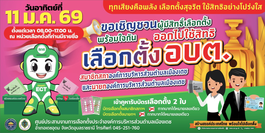 Thursday, 25 December 2025 09:07ประกาศประชาสัมพันธ์ ? 11 มกราคม 69 นี้! รวมพลังชาวเมืองเดช เข้าคูหาเลือกตั้ง อบต. ทุกเสียงคือพลัง! ขอเชิญชวนพี่น้องผู้มีสิทธิเลือกตั้งในเขตองค์การบริหารส่วนตำบลเมืองเดช ออกมาใช้สิทธิเลือกตั้งสมาชิกสภา และนายก อบต. เพื่อร่วมกันเพื่อพัฒนาตำบลเมืองเดชของเราให้ก้าวไกล ? วันอาทิตย์ที่ 11 มกราคม 2569 ⏰ เวลา 08.00 - 17.00 น. ? สถานที่ ณ หน่วยเลือกตั้งที่ท่านมีชื่ออยู่ ? สอบถามรายละเอียดเพิ่มเติม ศูนย์ประสานงานการเลือกตั้งประจำองค์การบริหารส่วนตำบลเมืองเดช อ.เดชอุดม จ.อุบลราชธานี โทร . 045-251-760 ?อย่าลืมเช็กสิทธิและหน่วยเลือกตั้งของท่าน! เตรียมบัตรประชาชนให้พร้อม แล้วออกมาใช้สิทธิ์ เพื่อเมืองเดชที่น่าอยู่ของเรา! ?️✨