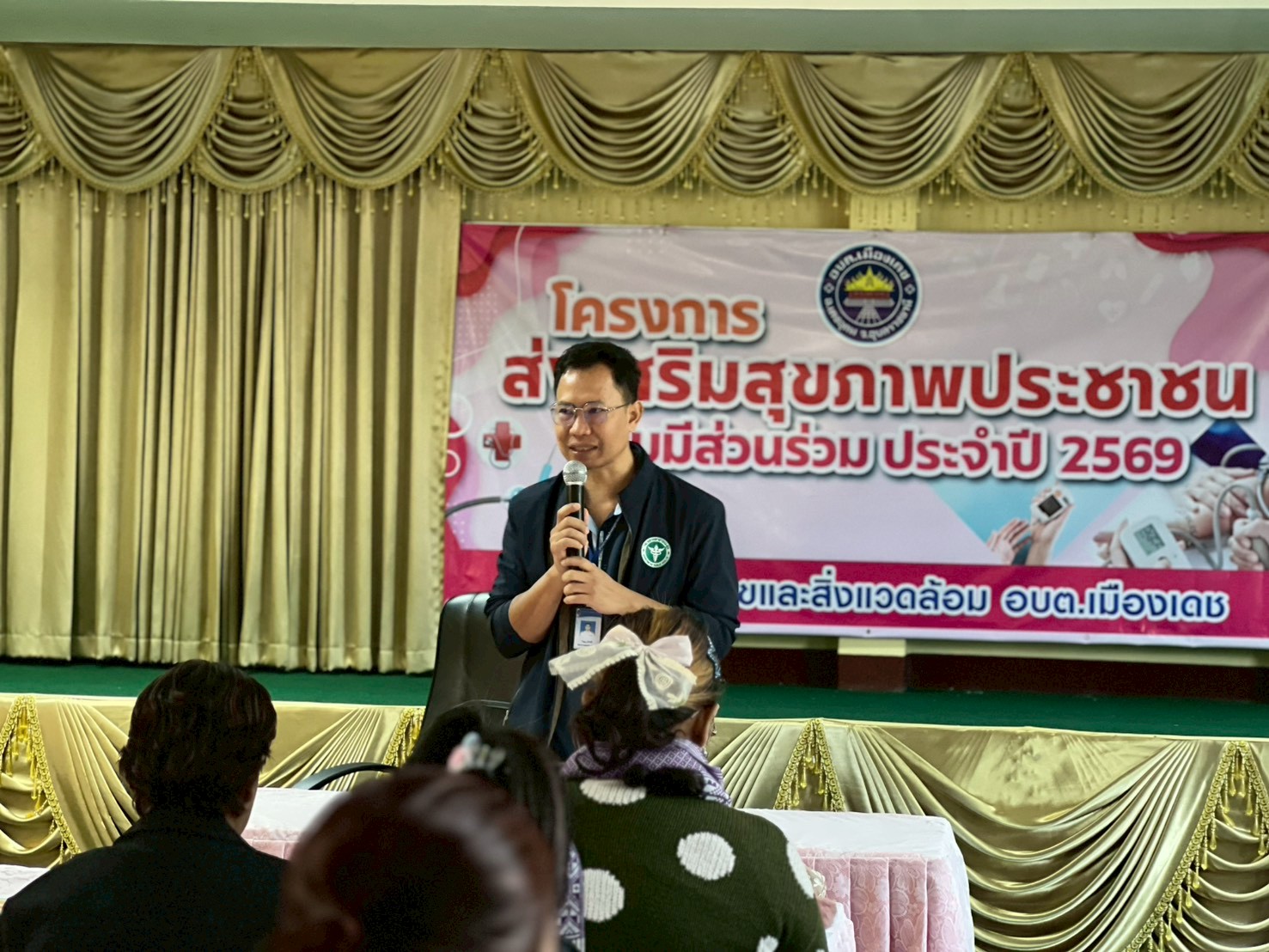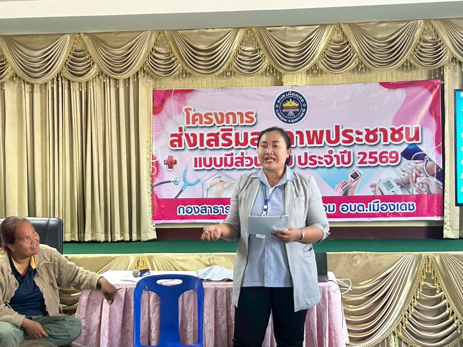 Thursday, 15 January 2026 11:15วันที่ 15 มกราคม 2569 เวลา 09.00 น. นายชลัท แสนศาลา รองปลัดองค์การบริหารส่วนตำบลเมืองเดช พร้อมด้วยหัวหน้าส่วนราชการ พนักงานส่วนตำบล และคณะวิทยากร จากศูนย์สุขภาพชุมชนเมืองบ้านโคกเถื่อนช้าง ได้เป็นประธานในพิธีเปิดโครงการส่งเสริมสุขภาพประชาชนแบบมีส่วนร่วม ประจำปีงบประมาณ 2569 เพื่อให้ประชาชนที่มีส่วนร่วมในการจัดการสุขภาพ และเกิดการปรับเปลี่ยนพฤติกรรมสู่การจัดการสุขภาพที่ยังยืน ตั้งแต่ระดับบุคคล ครอบครัว หมู่บ้าน โดยคนในชุมชนสามารถดูแลส่งเสริมสุขภาพได้ด้วยตนเอง องค์รวม กายใจสังคม สิ่งแวดล้อมที่ประกอบเป็นสุขภาพที่ดีของคนในชุมชน ณ อาคาร ศพอส.อบต.เมืองเดช ตำบลเมืองเดช อำเภอเดชอุดม จังหวัดอุบลราชธานี