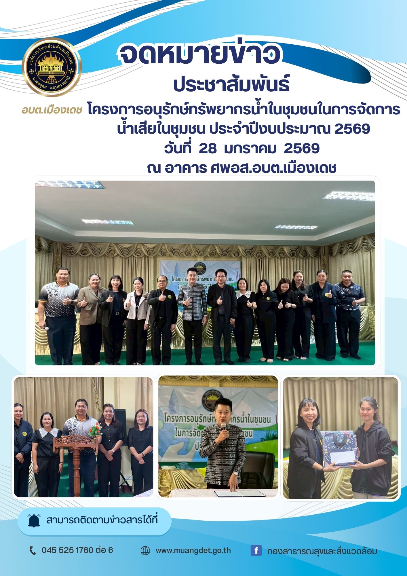Wednesday, 28 January 2026 15:47วันที่ 28 มกราคม 2569 เวลา 09.00 น. นายปัญญาปกร วิรักขะโม ปลัดองค์การบริหารส่วนตำบลเมืองเดช ปฏิบัติหน้าที่นายกองค์การบริหารส่วนตำบลเมืองเดช พร้อมด้วยนายชลัท แสนศาลา รองปลัดองค์การบริหารส่วนตำบลเมืองเดช และหัวหน้าส่วนราชการ พนักงานส่วนตำบล ได้เป็นประธานในพิธีเปิดโครงการอนุรักษ์ทรัพยากรน้ำในชุมชนในการจัดการน้ำเสียในชุมชน ประจำปีงบประมาณ 2569 เพื่อสร้างความรู้ ความเข้าใจ เรื่องการจัดการน้ำเสียในชุมชน และสามารถนำความรู้มาประยุกต์ใช้ในพื้นที่รับผิดชอบตนเองได้ ณ อาคาร ศพอส.อบต.เมืองเดช ตำบลเมืองเดช อำเภอเดชอุดม จังหวัดอุบลราชธานี