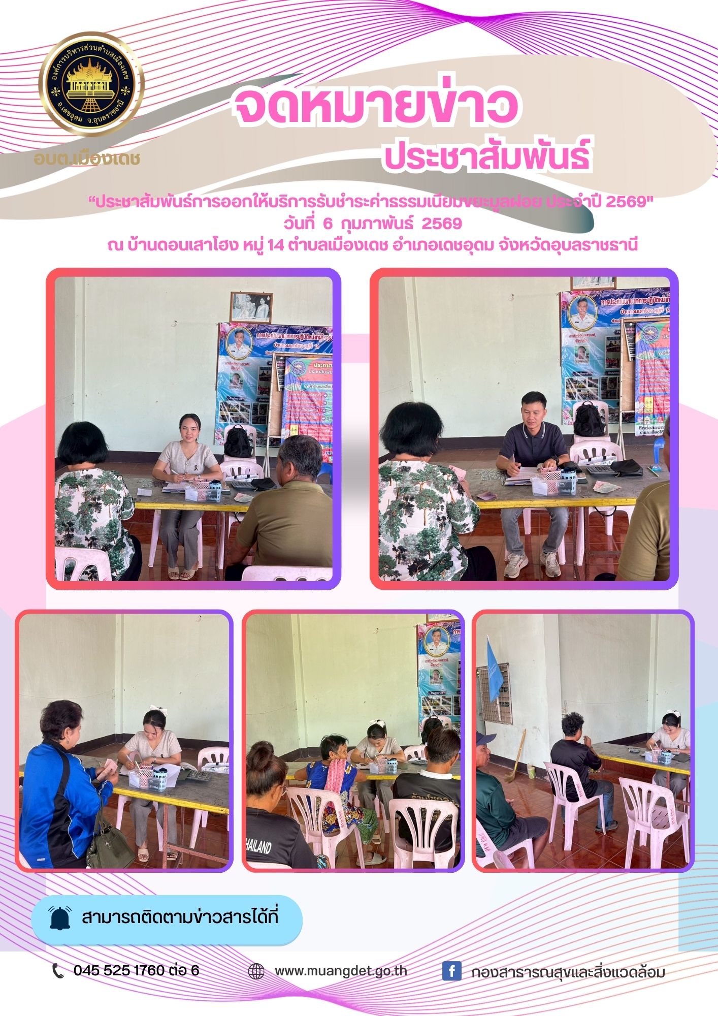 Friday, 06 February 2026 14:32วันที่ 6 กุมภาพันธ์ 2569 งานสิ่งแวดล้อม กองสาธารณสุขและสิ่งแวดล้อม องค์การบริหารส่วนตำบลเมืองเดช ได้ออกให้บริการรับชำระค่าธรรมเนียมขยะมูลฝอยนอกสถานที่ ประจำปีงบประมาณ 2569 ณ ศาลาประชาคมบ้านดอนเสาโฮง หมู่ที่ 14 ตำบลเมืองเดช อำเภอเดชอุดม จังหวัดอุบลราชธานี และมีผู้มาใช้บริการ จำนวน 38 ราย ได้รับความร่วมมือจากผู้นำชุมชนเป็นอย่างดี