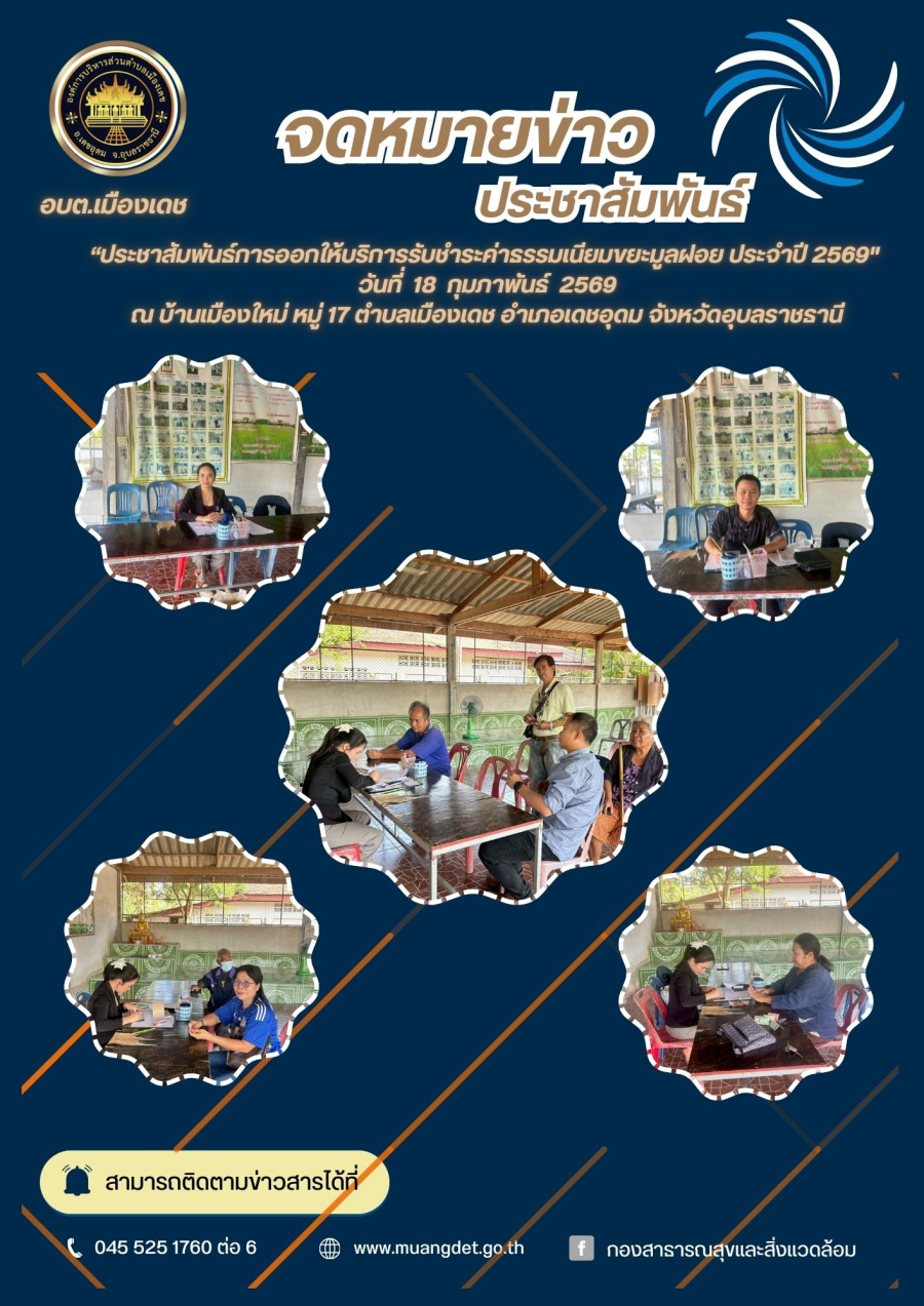 Wednesday, 18 February 2026 15:32วันที่ 18 กุมภาพันธ์ 2569 งานสิ่งแวดล้อม กองสาธารณสุขและสิ่งแวดล้อม องค์การบริหารส่วนตำบลเมืองเดช ได้ออกให้บริการรับชำระค่าธรรมเนียมขยะมูลฝอยนอกสถานที่ ประจำปีงบประมาณ 2569 ณ ศาลาประชาคมบ้านเมืองใหม่ หมู่ที่ 17 ตำบลเมืองเดช อำเภอเดชอุดม จังหวัดอุบลราชธานี และมีผู้มาใช้บริการ จำนวน 20 ราย ได้รับความร่วมมือจากผู้นำชุมชนเป็นอย่างดี