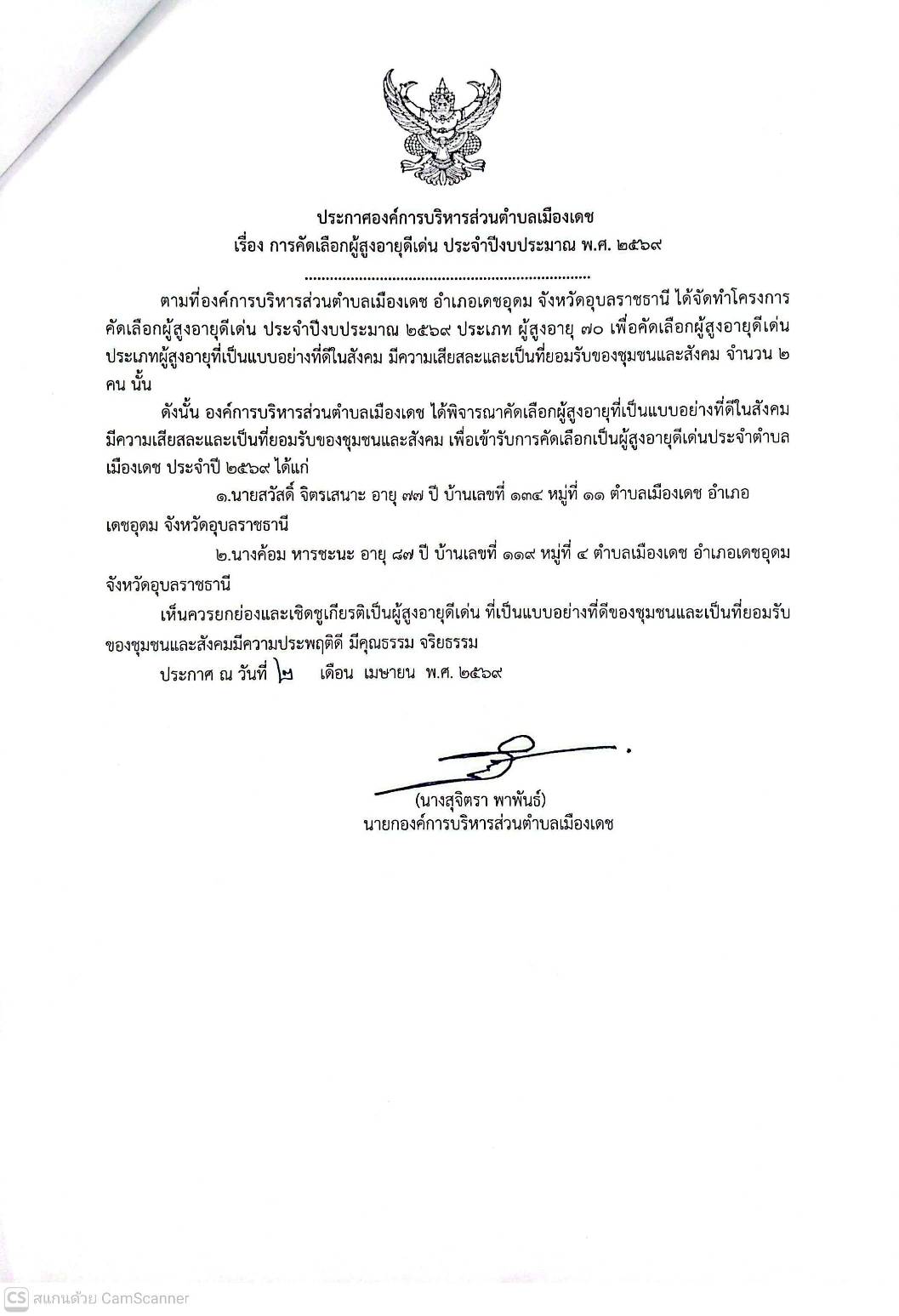 Thursday, 09 April 2026 15:40องค์การบริหารส่วนตำบลเมืองเดช ได้พิจารณาคัดเลือกผู้สูงอายุที่เป็นแบบอย่างที่ดีในสังคม มีความเสียสละและเป็นที่ยอมรับของชุมชนและสังคม เพื่อเข้ารับการคัดเลือกเป็นผู้สูงอายุดีเด่นประจำตำบลเมืองเดช ประจำปี 2569 ได้แก่ 1.นายสวัสดิ์ จิตรเสนาะ อายุ 77 ปี บ้านเลขที่ 134 หมู่ที่ 11 ตำบลเมืองเดช อำเภอ เดชอุดม จังหวัดอุบลราชธานี 2.นางค้อม หารชะนะ อายุ 87 ปี บ้านเลขที่ 119 หมู่ที่ 4 ตำบลเมืองเดช อำเภอเดชอุดม จังหวัดอุบลราชธานี เห็นควรยกย่องและเชิดชูเกียรติเป็นผู้สูงอายุดีเด่น ที่เป็นแบบอย่างที่ดีของชุมชนและเป็นที่ยอมรับของชุมชนและสังคมมีความประพฤติดี มีคุณธรรม จริยธรรม