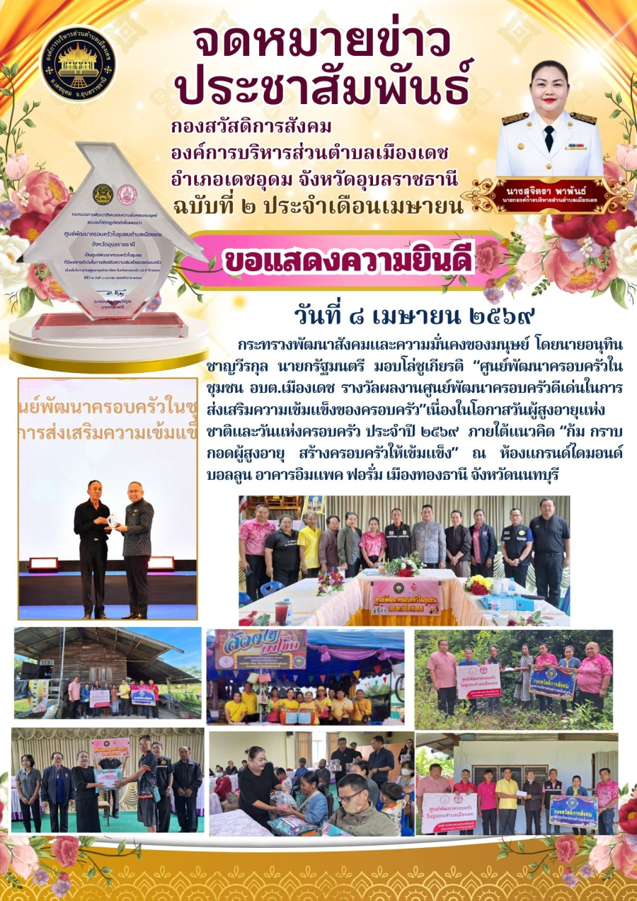 Friday, 10 April 2026 10:04เมื่อวันที่ 8 เมษายน 2569 กระทรวงการพัฒนาสังคมและความมั่นคงของมนุษย์(พม.) โดยนายอนุทิน ชาญวีรกูล นายกรัฐมนตรี และรัฐมนตรีว่าการกระทรวงมหาดไทย เป็นประธานในพิธีมอบรางวัล ผลงานศูนย์พัฒนาครอบครัวดีเด่นในการส่งเสริมความเข้มแข็งของครอบครัว เนื่องในโอกาสวันผู้สูงอายุแห่งชาติและวันครอบครัว ประจำปี 2569 ให้กับองค์การบริหารส่วนตำบลเมืองเดช โดยนางสุจิตรา พาพันธ์ นายกงค์การบริหารส่วนตำบลเมืองเดช มอบหมายให้นายสุรพงษ์ เพิ่มสมบัติ รองนายกงค์การบริหารส่วนตำบลเมืองเดช เป็นตัวแทนรับมอบ ณ ห้องแกรนด์ไดมอนด์ บอลรูม อาคารอิมแพค ฟอรั่ม เมืองทองธานี จังหวัดนนทบุรี