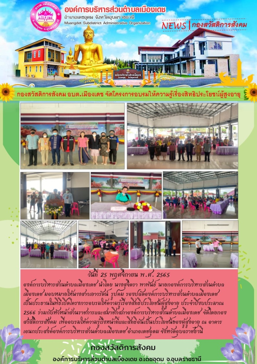วันที่ 25 พฤศจิกายน พ.ศ. 2565องค์กรบริหารส่วนตำบลเมืองเดช นำโดย นางสุจิตรา พาพันธ์ นายกองค์การบริหารส่วนตำบลเมืองเดช มอบหมายให้นางสาวเยารัตน์ รูปคม รองปลัดองค์การบริหารส่วนตำบลเมืองเดชเป็นประธานในพิธีเปิดโครงการอบรมให้ความรู้เรื่องสิทธิประโยชน์ผู้สูงอายุ ประจำปีงบประมาณ2566 ร่วมกับหัวหน้าส่วนราชการและสมาชิกสภาองค์การบริหารส่วนตำบลเมืองเดช