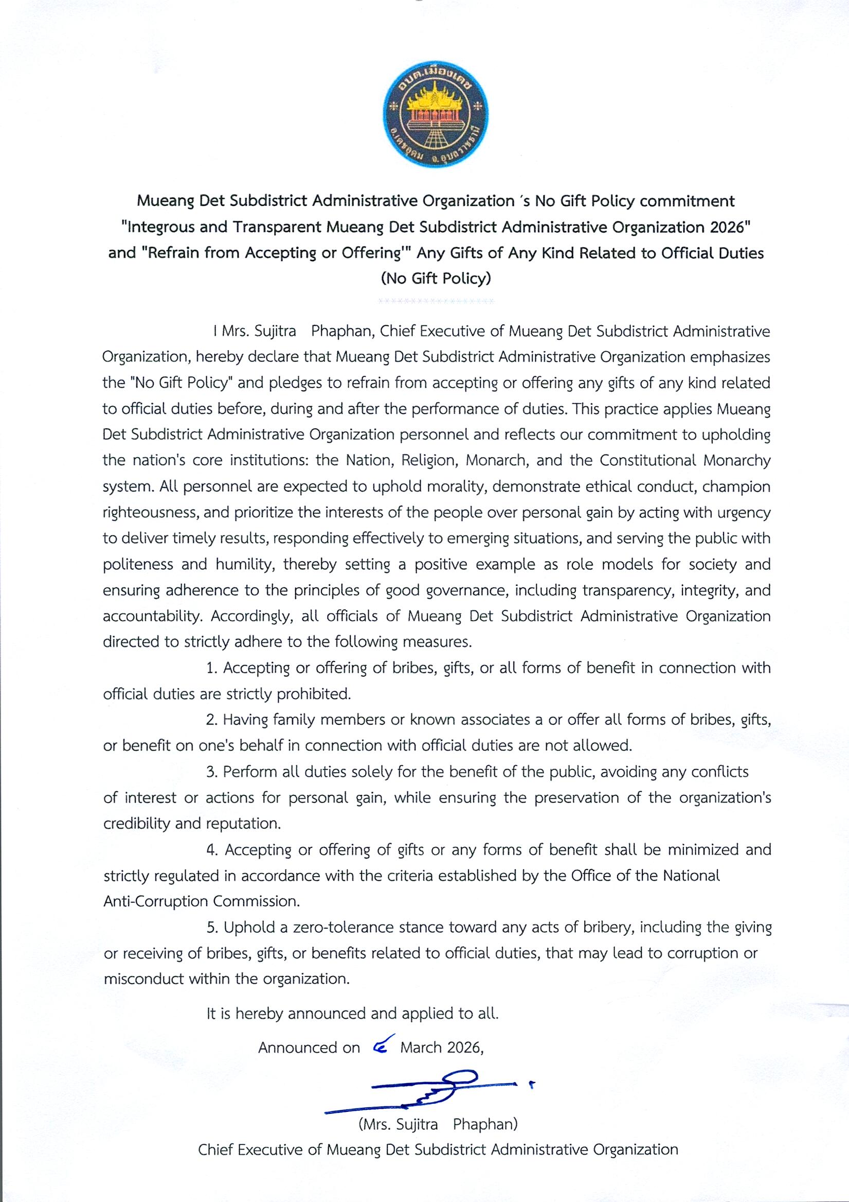ประกาศ เรื่อง นโยบายไม่รับของขวัญ และของกำนัลทุกชนิดจากการปฏิบัติหน้าที่ (์No Gift Policy)ประจำปีงบประมาณ 2569 องค์การบริหารส่วนตำบลเมืองเดช (ฉบับ ภาษาอังกฤษ)