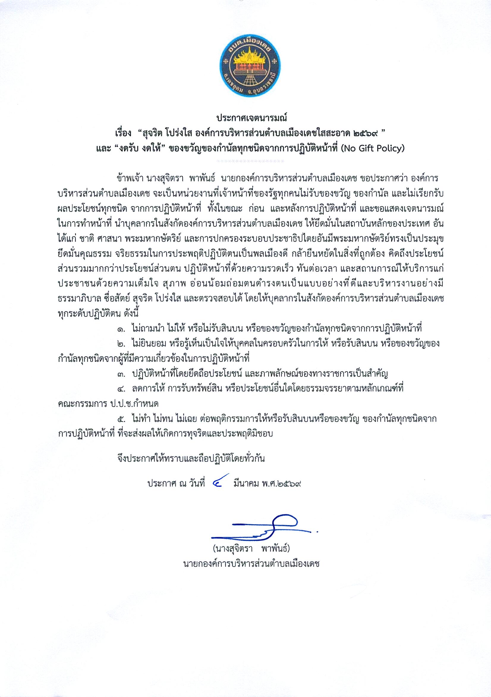 ประกาศ เรื่อง นโยบายไม่รับของขวัญ และของกำนัลทุกชนิดจากการปฏิบัติหน้าที่ (์No Gift Policy)ประจำปีงบประมาณ 2569 องค์การบริหารส่วนตำบลเมืองเดช (ฉบับ ภาษาไทย)