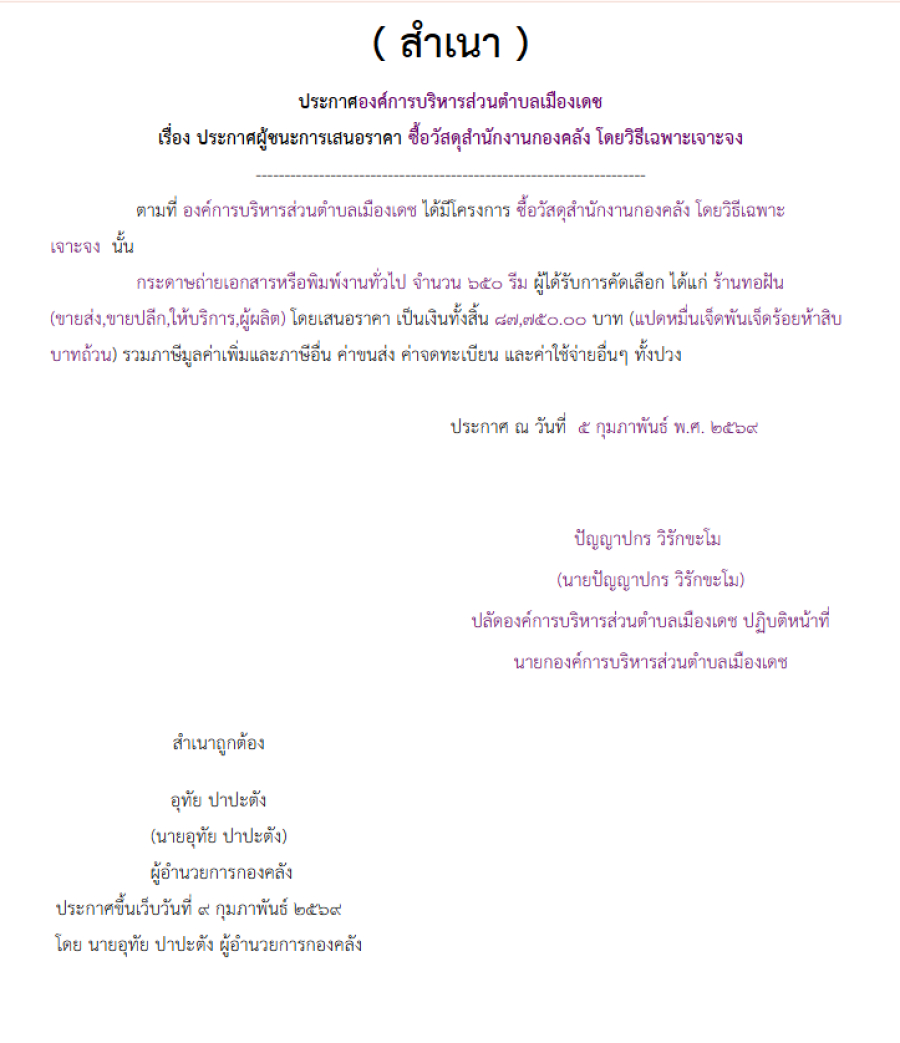 ซื้อวัสดุสำนักงานกองคลัง โดยวิธีเฉพาะเจาะจง (เลขที่โครงการ : 69029117390)