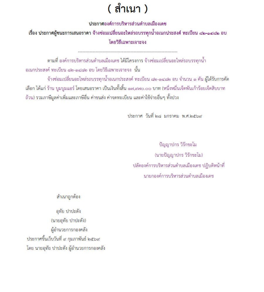 จ้างซ่อมเปลี่ยนอะไหล่รถบรรทุกน้ำอเนกประสงค์ ทะเบียน 82-1482 อบ โดยวิธีเฉพาะเจาะจง (เลขที่โครงการ : 69029151073)