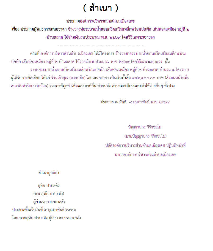 จ้างวางท่อระบายน้ำคอนกรีตเสริมเหล็กพร้อมบ่อพัก เส้นห่องเหมือง หมู่ที่ 2 บ้านตลาด ใช้จ่ายเงินงบประมาณ พ.ศ. 2569 โดยวิธีเฉพาะเจาะจง (เลขที่โครงการ : 69019464665)