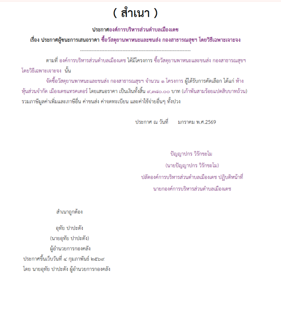 ซื้อวัสดุยานพาหนะและขนส่ง กองสาธารณสุขฯ โดยวิธีเฉพาะเจาะจง (เลขที่โครงการ : 69019441974)