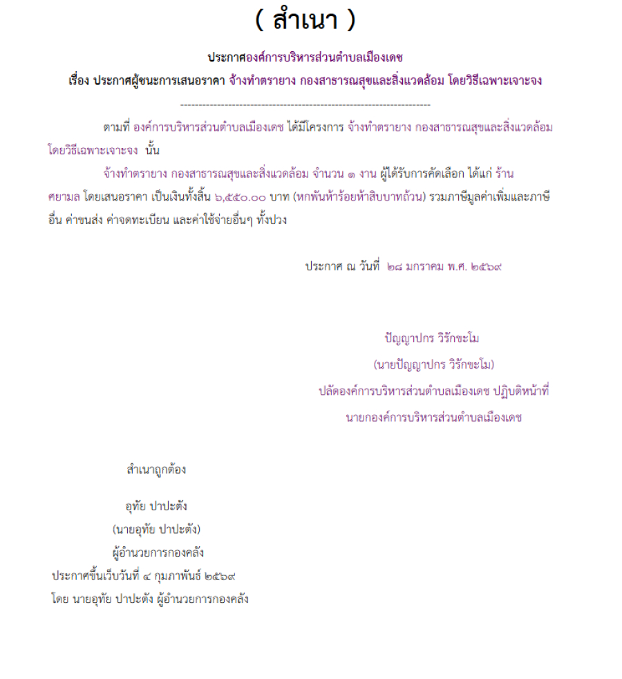 จ้างทำตรายาง กองสาธารณสุขและสิ่งแวดล้อม โดยวิธีเฉพาะเจาะจง (เลขที่โครงการ : 69019483455)