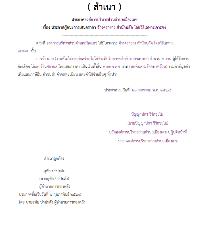 จ้างตรายาง สำนักปลัด โดยวิธีเฉพาะเจาะจง (เลขที่โครงการ : 69029016599)