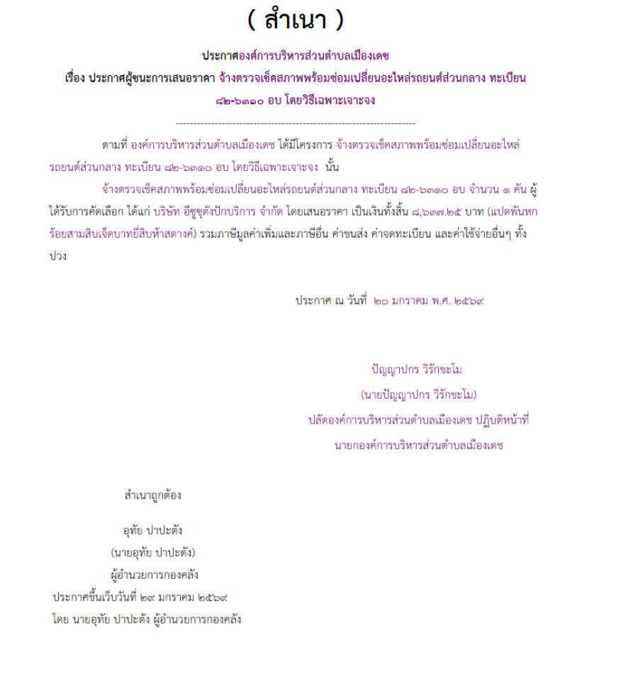 จ้างตรวจเช็คสภาพพร้อมซ่อมเปลี่ยนอะไหล่รถยนต์ส่วนกลาง ทะเบียน 82-6310 อบ โดยวิธีเฉพาะเจาะจง (เลขที่โครงการ : 69019340203)