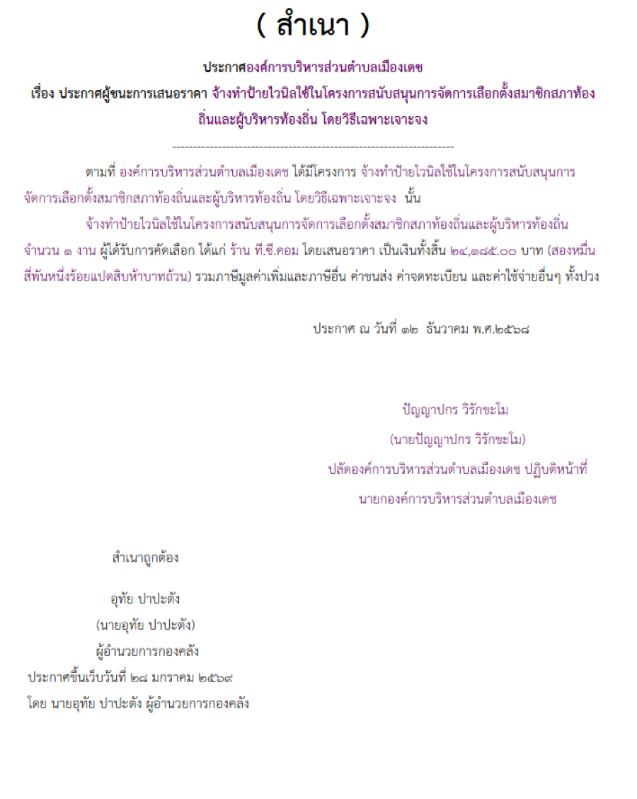 จ้างทำป้ายไวนิลใช้ในโครงการสนับสนุนการจัดการเลือกตั้งสมาชิกสภาท้องถิ่นและผู้บริหารท้องถิ่น โดยวิธีเฉพาะเจาะจง (เลขที่โครงการ : 69019498220)