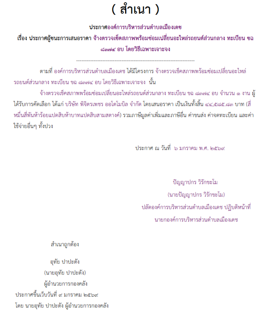 จ้างตรวจเช็คสภาพพร้อมซ่อมเปลี่ยนอะไหล่รถยนต์ส่วนกลาง ทะเบียน ขฉ 8374 อบ โดยวิธีเฉพาะเจาะจง (เลขที่โครงการ : 69019048175)